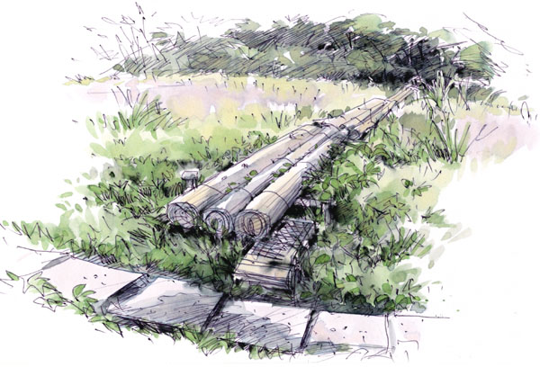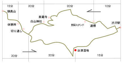 帰路は渋沢丘陵方面に右回。途中、谷津湿地の看板、奥を見ると石畳が続く草の広場が見えたので、石畳に誘われてぐるっとひとまわりすると、確かに足下は湿気があり石畳みも水面に浮いた感じ。「谷津湧水」の案内があるがそれらしき仕掛けもなくただ草茫茫の広場。中央に池を横断する木の渡し橋が湿地の名残りの様です。市の観光案内には次のように「谷津湧水-